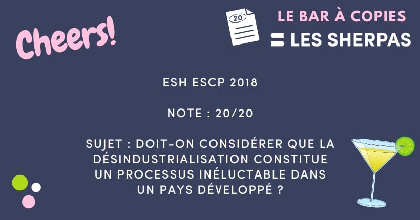 Merci à Clément V. (élève à HEC) de nous partager sa copie d’ESH ESCP (économie, sociologie et histoire du monde contemporain) ayant eu la note de 20/20 ! L’intitulé du sujet était “Doit-on considérer que la désindustrialisation constitue un processus inéluctable dans un pays développé ?”, et a eu lieu lors de l’épreuve d’ESH ESCP en 2018 😎 Tu peux retrouver la super copie de Clément juste un peu plus bas dans la page !