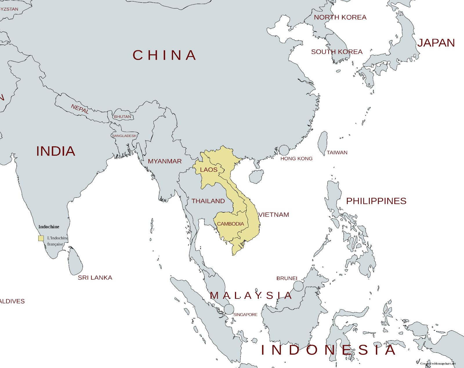 L’Indochine était une région située en Asie du Sud-Est et comprenait plusieurs pays, dont le Vietnam 🇻🇳, le Laos 🇱🇦 et le Cambodge 🇰🇭. Au cours de son histoire, le territoire de l’Indochine a connu différentes évolutions.
