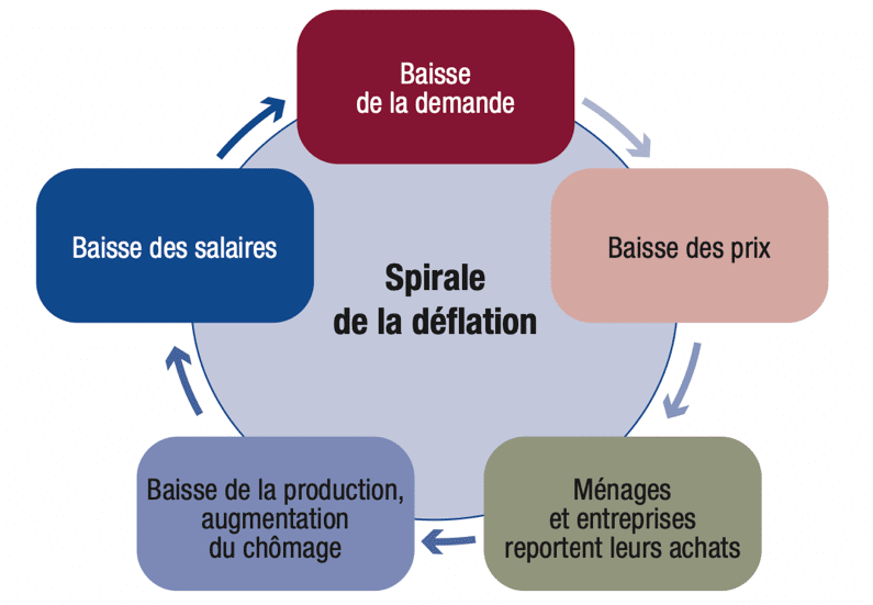 La déflation, c’est tout simplement l’inverse de l’inflation. Ça signifie que les prix baissent de manière générale, à court terme ça semble une bonne chose pour les consommateurs et le pouvoir d’achat, la monnaie permet de s’offrir plus de choses.