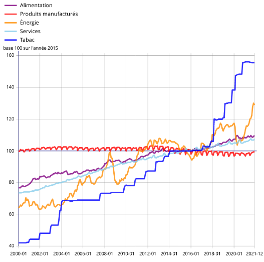📌 Les politiques publiques, l’exemple le plus parlant, c’est l’augmentation des taxes sur le tabac en raison de la politique de santé publique. Selon les statistiques de l’Insee, en moyenne, son prix a augmenté de 55,8 % entre 2015 et 2021.