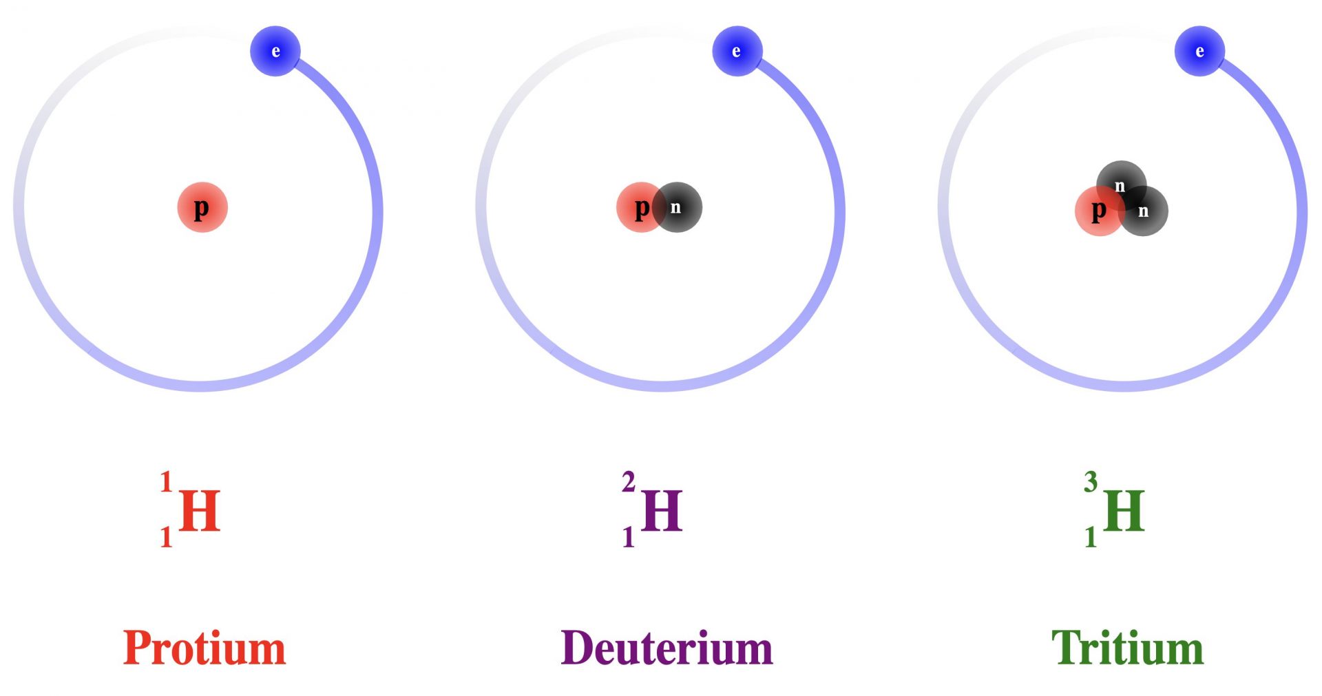 Pour te permettre de mieux comprendre ce que l’on te raconte, on te propose de découvrir les schémas ci-dessous. Ils symbolisent les isotopes de l’hydrogène.