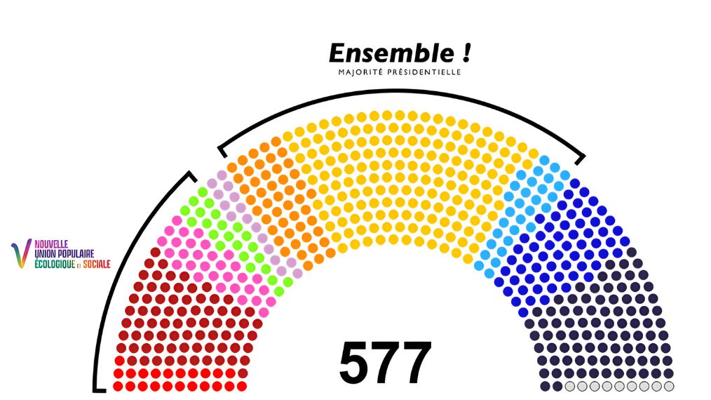 Bon, inutile de te détailler le nombre de représentants de chaque parti, mais un truc saute aux yeux : il y a des points jaunes. Et devine quel parti ils représentent ? Renaissance, le parti du Président en poste Emmanuel Macron, qui ne dispose pas d’une majorité absolue, mais seulement d’une majorité relative. La majorité présidentielle doit donc collaborer et faire des compromis avec les autres partis pour pouvoir faire voter les lois.