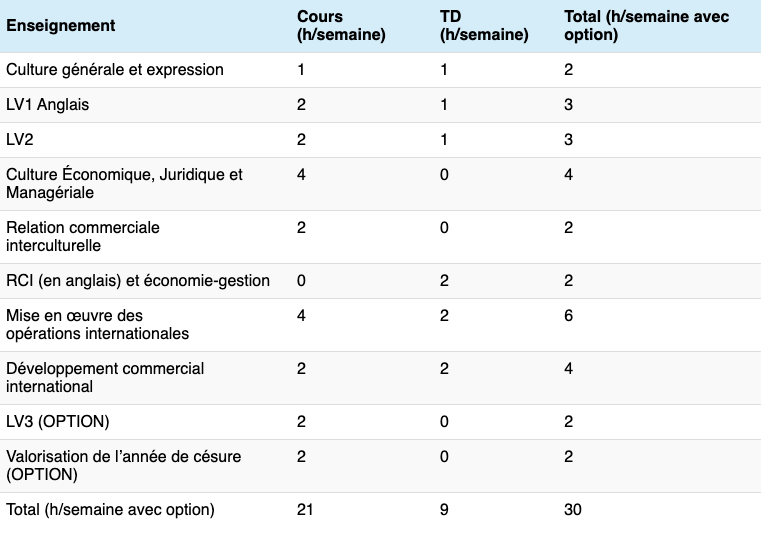 En BTS Commerce International, tu devrais avoir une trentaine d’heures de cours, réparties entre cours et TD. Cette répartition de cours change légèrement entre la première et deuxième année. Pas de panique, on te détaille ça ci-dessous 🤝