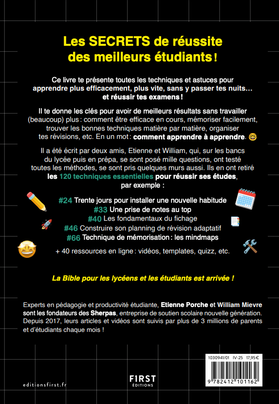 Que tu sois lycéen ou étudiant du supérieur, tu y trouveras 120 méthodes testées et approuvées pour apprendre mieux, gérer ton temps, rester motivé, et progresser sans galérer.