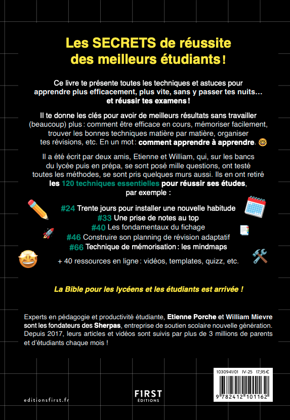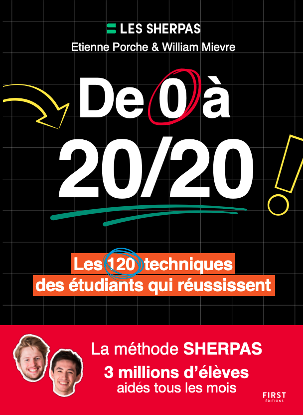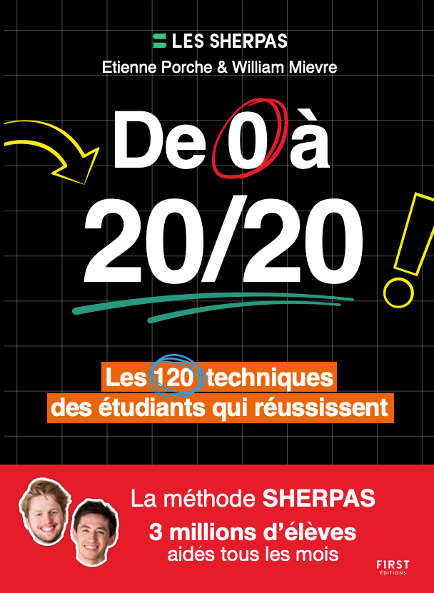 Pensé par Etienne et William, De 0 à 20/20 dévoile la méthode Sherpas®. Il regroupe toutes leurs meilleures techniques pour t’aider à réussir plus efficacement, plus rapidement… et sans y passer tes nuits !